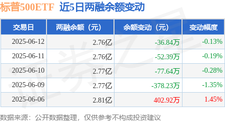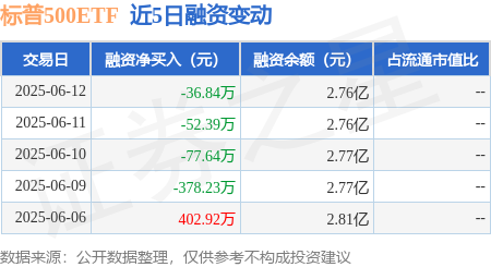 本站消息,6月12日,标普500ETF(513500)融资买入921.53万元,融资偿还958.37万元,融资净卖出36.84万元,融资余额2.76亿元。